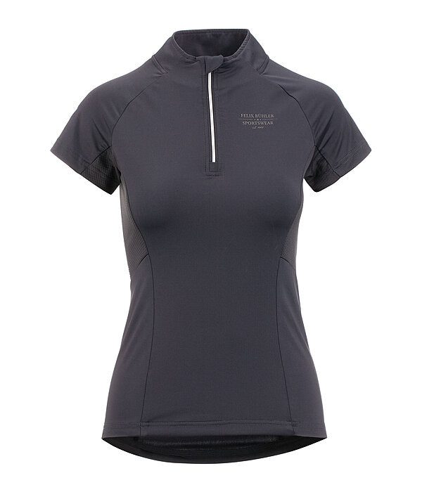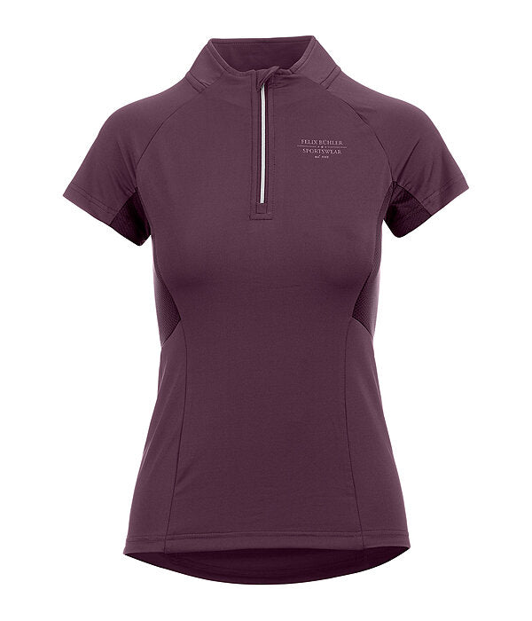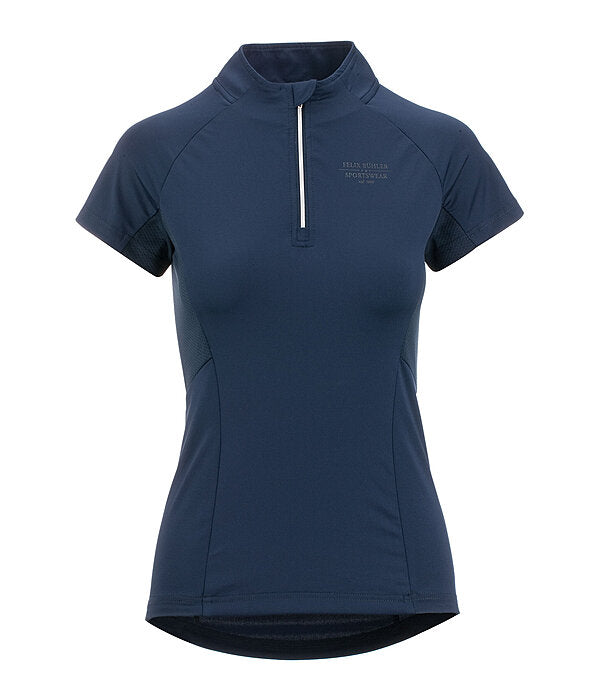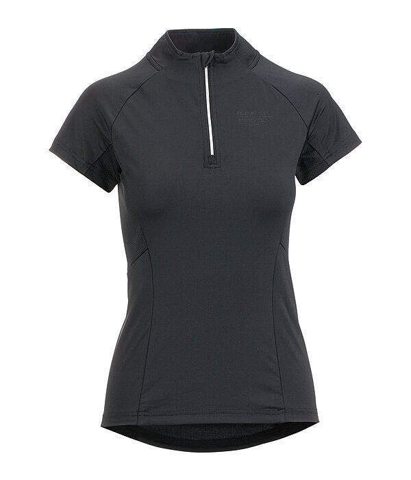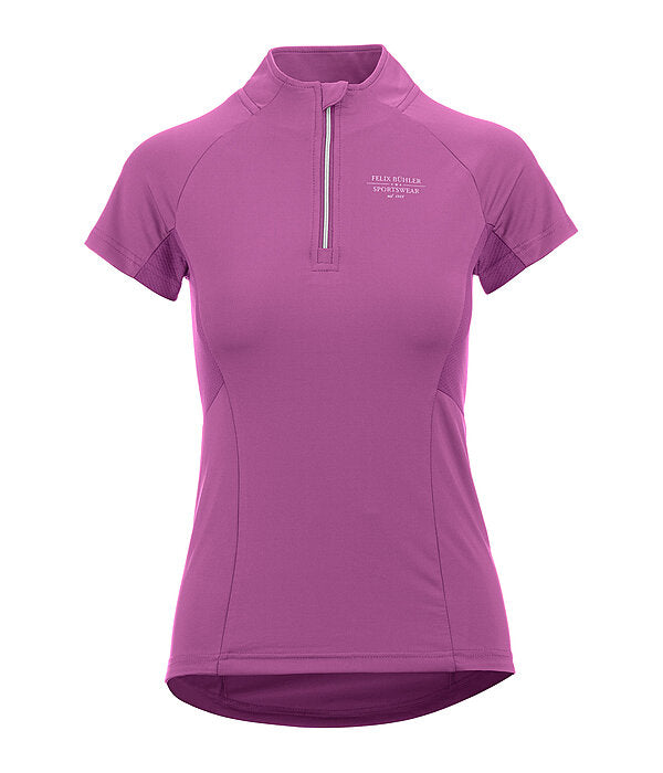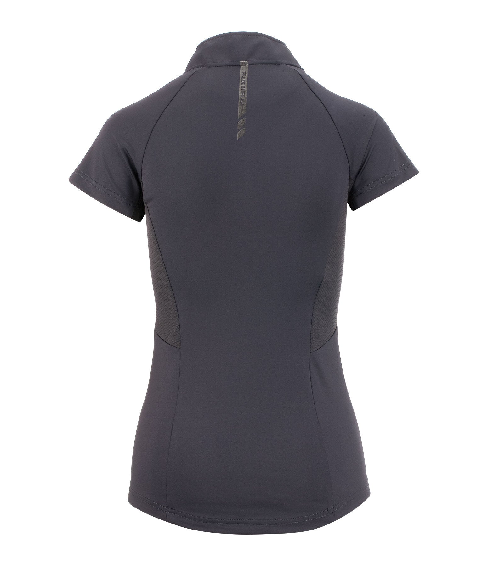 Camiseta de manga corta, elástica y suave, con cremallera brillante y cuello alto. Excelente transpirabilidad gracias a los paneles laterales de malla. Mangas raglán. Secado rápido. Composición: 88 % poliéster, 12 % elastano.