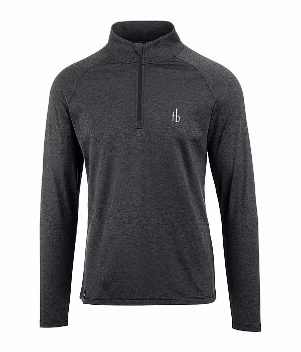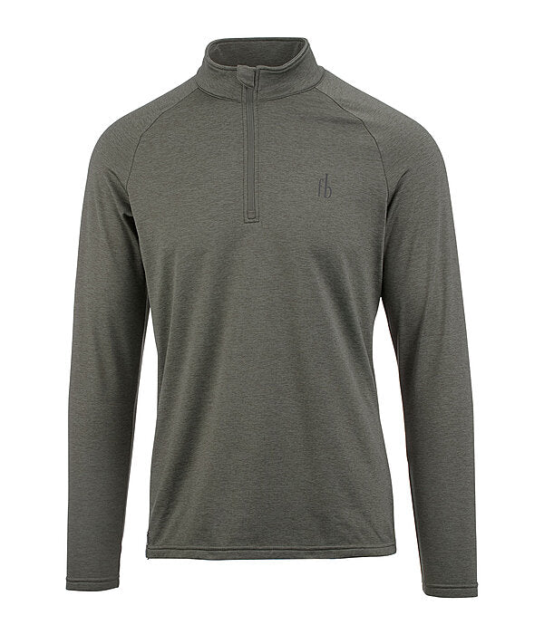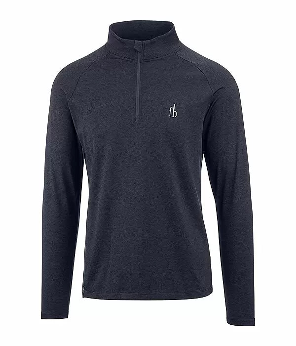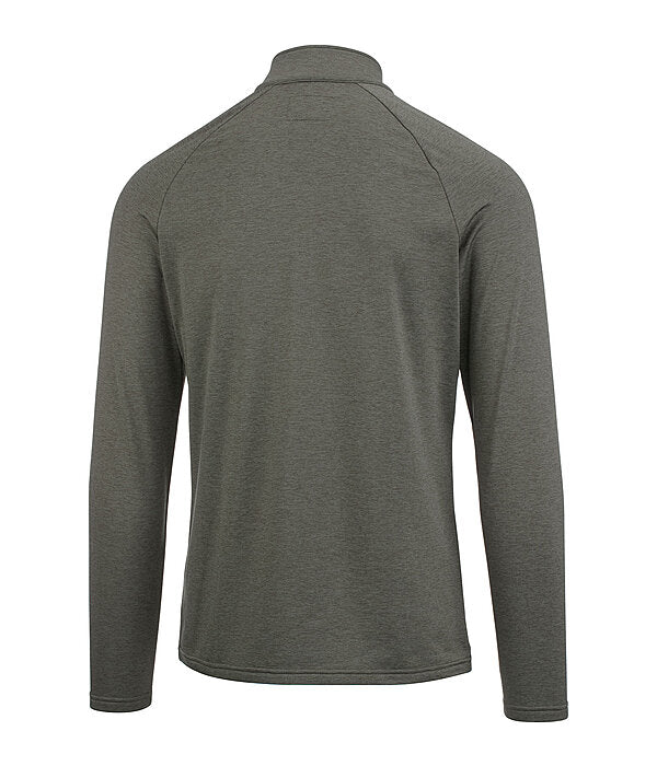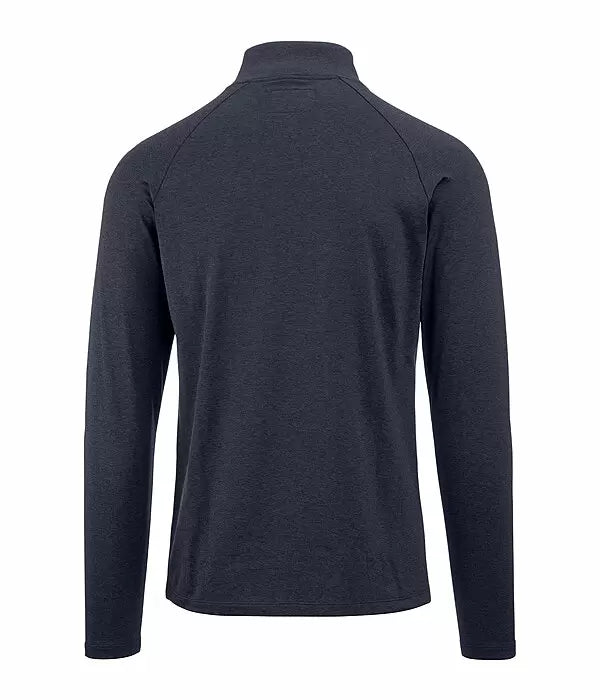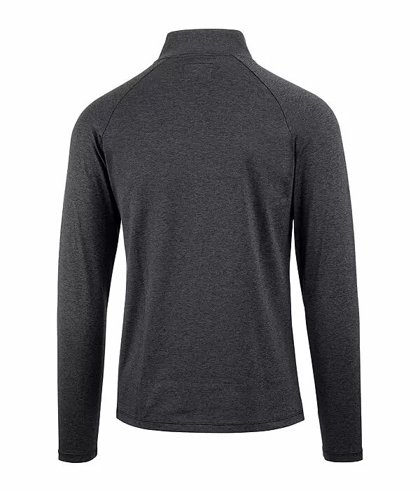 Camiseta deportiva de manga larga con cuello alto y efecto jaspeado. Transpirable y de secado rápido. Cierre de cremallera con protector de barbilla en el cuello, mangas raglán.