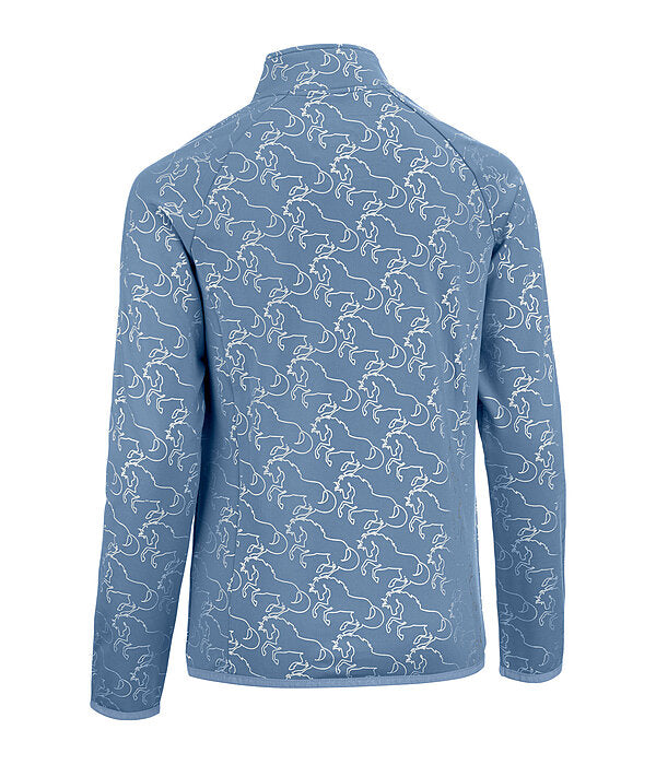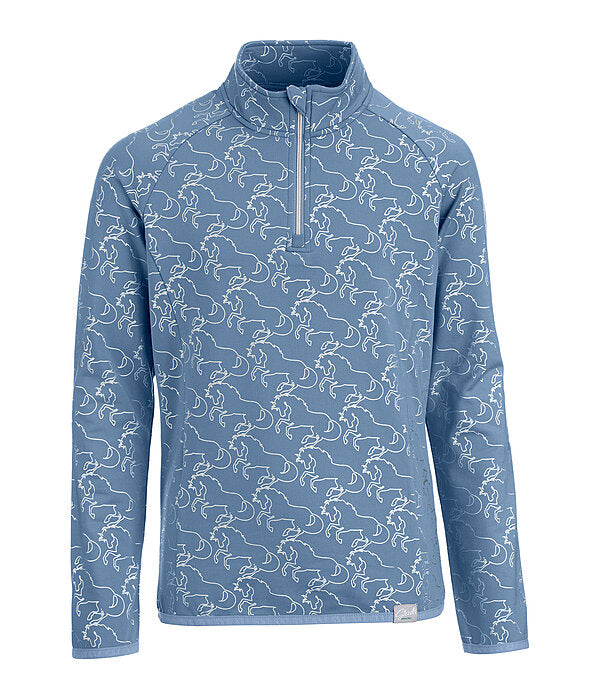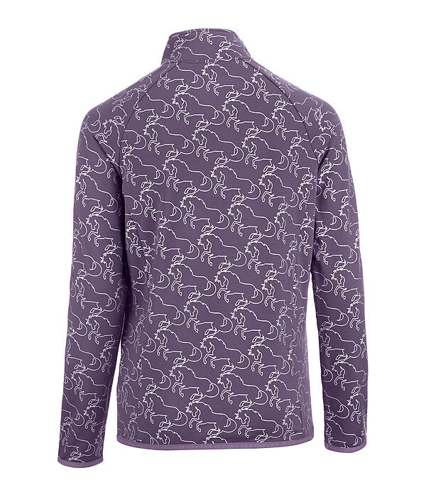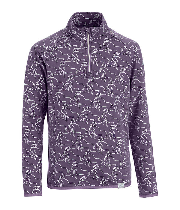 Camiseta deportiva infantil de manga larga con un bonito estampado de caballos con purpurina. Cuenta con mangas raglán, cuello alto con cremallera y protector de barbilla, y un suave forro interior. Transpirable y de secado rápido.