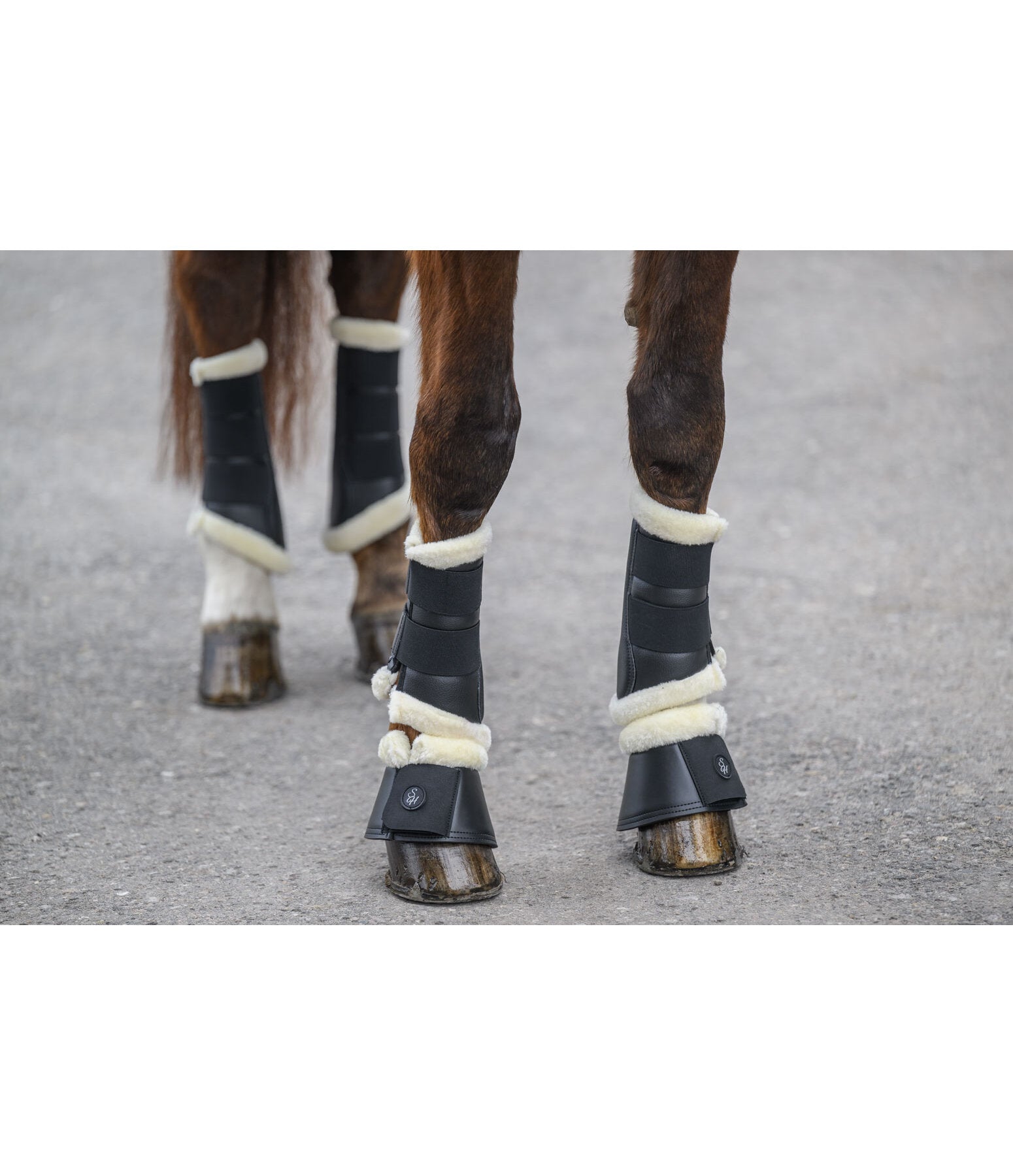 Campanas con material en el interior de caucho de cloropreno, material exterior de piel sintética resistente y ribete de suave piel sintética para evitar rozaduras. Cierre doble de velcro ancho para un ajuste seguro. 100 % poliéster. Se venden por pares.