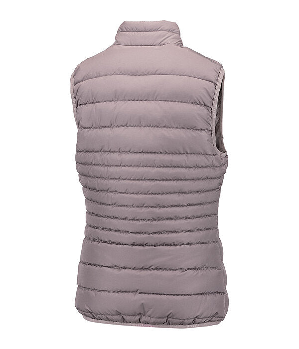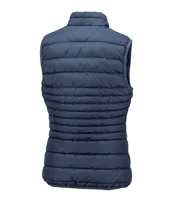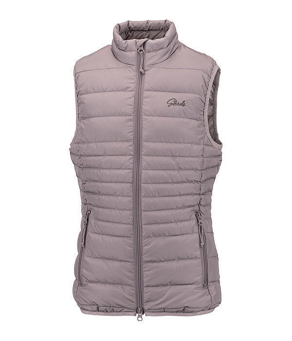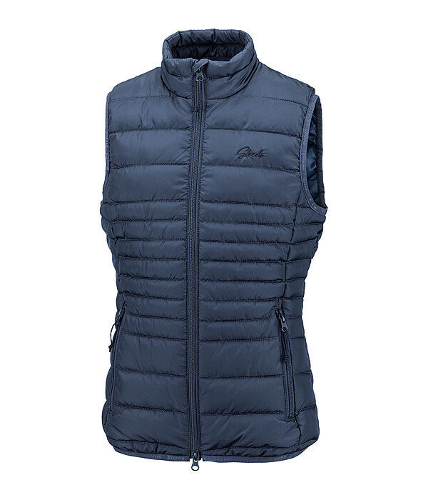 Chaleco ligero de equitación para niños con cuello alto pequeño y puños y bajo elásticos. Cuenta con cremallera frontal bidireccional forrada con protector de barbilla, dos bolsillos delanteros con cremallera y discreto logotipo bordado en el pecho. 100% poliéster.