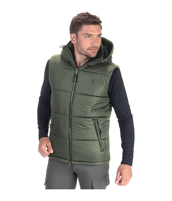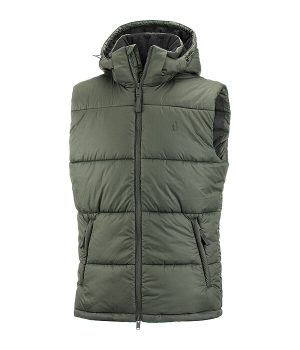 Chaleco deportivo acolchado con capucha desmontable y relleno cálido. El cuello está forrado con suave forro polar. Cuenta con una cremallera bidireccional oculta con protector de barbilla y dos bolsillos delanteros ocultos con cremallera. 100% poliéster.