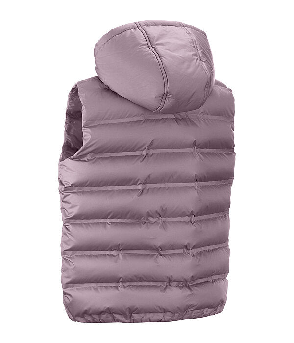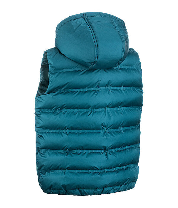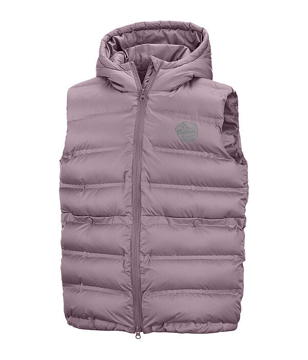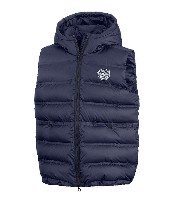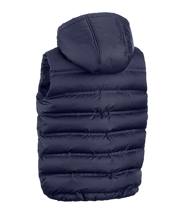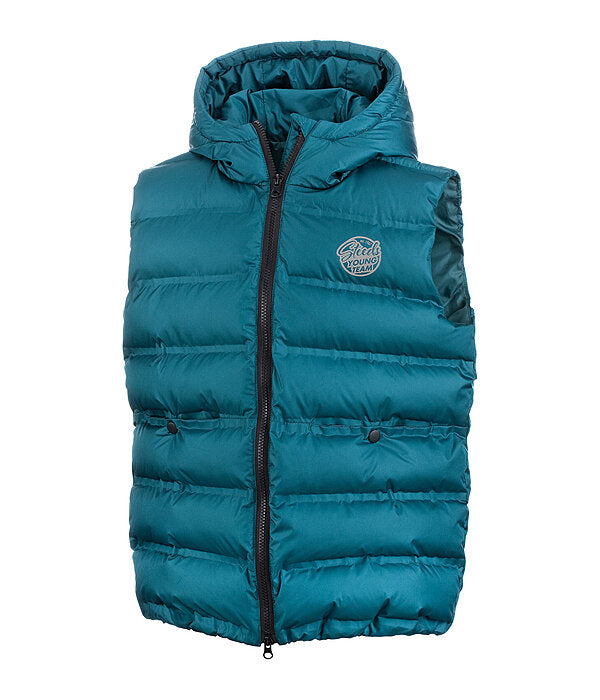 Chaleco deportivo acolchado para niños con cuello alto y capucha. Cuenta con cremallera frontal bidireccional con forro en contraste y protector de barbilla, dos bolsillos delanteros con cierre a presión, bajo elástico y estampado Acolchado suave con costuras termoselladas. 100% poliéster.