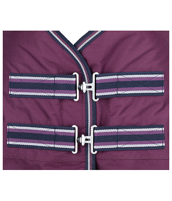 Manta de invierno clásica, impermeable y transpirable, confeccionada en tejido ripstop de 600 deniers (3000 mm de columna de agua, costuras selladas) con un cálido relleno de 100 g. Incorpora un fuelle para una óptima libertad de movimiento, cierre de pecho con doble gancho en T y cierre adicional de velcro, cinchas cruzadas ajustables y una solapa de cola. Incluye puntos de fijación para correas y una correa de cola ajustable en longitud. Con almohadilla en la cruz para evitar puntos de presión y rozaduras. Forro suave que no daña el pelaje. 100% poliéster