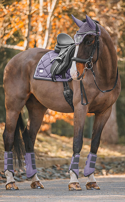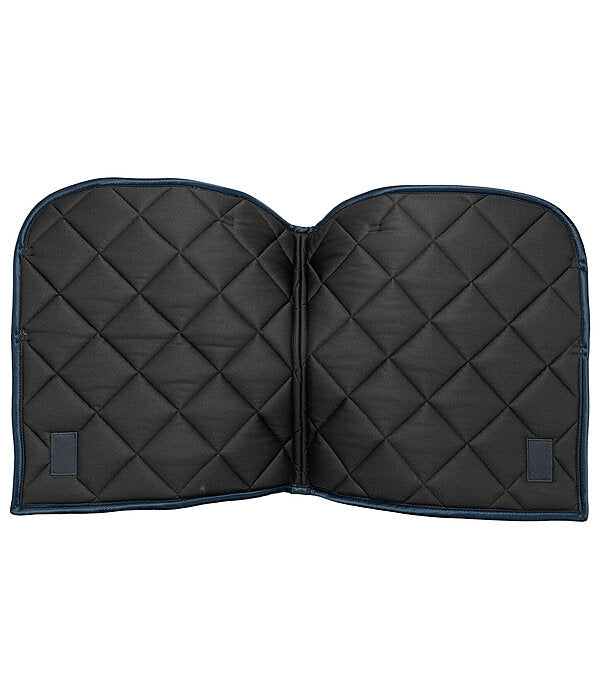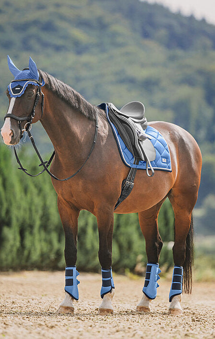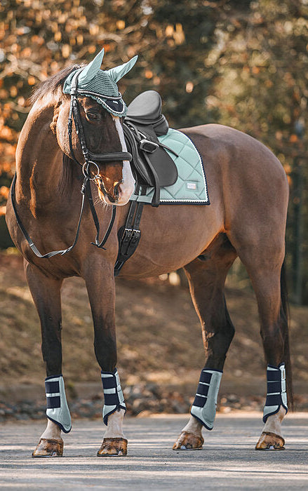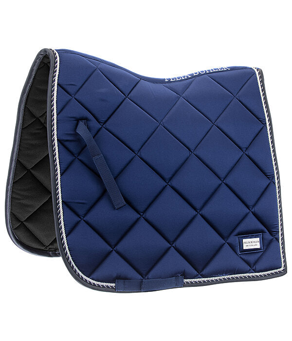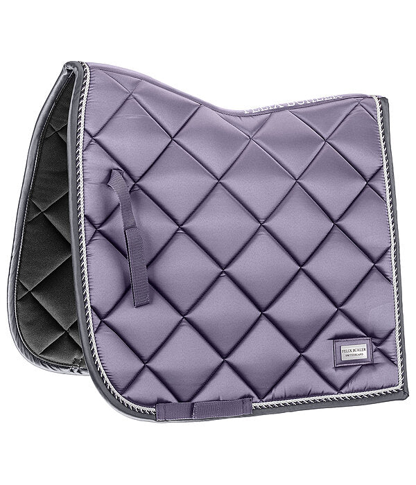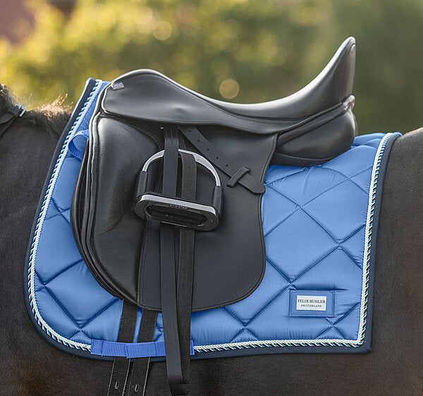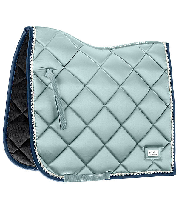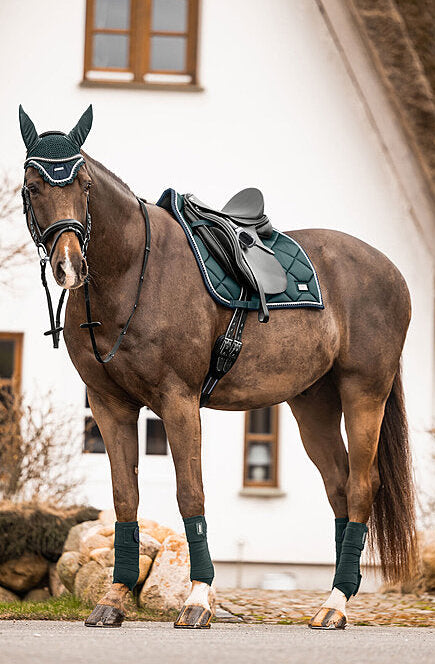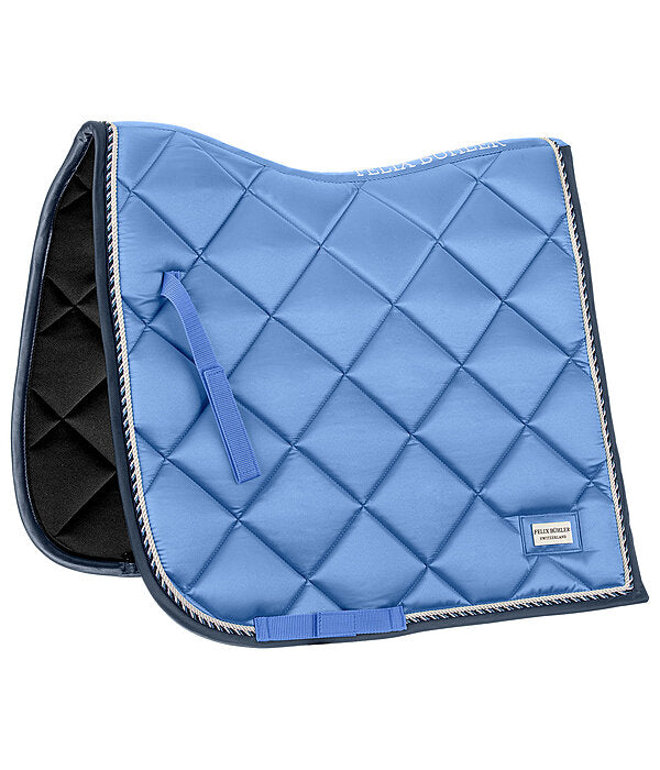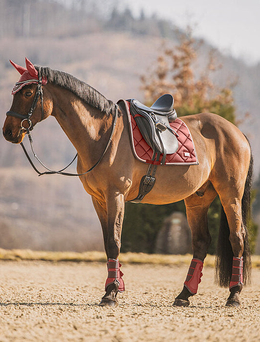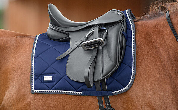 Elegante mantilla de corte cuadrado con una llamativa placa metálica brillante con el logotipo. Tejido exterior sedoso y brillante, con cordones decorativos a juego. Presillas para la silla y la cincha con prácticos cierres de velcro. Parte inferior de malla transpirable que absorbe la humedad. 100% poliéster.