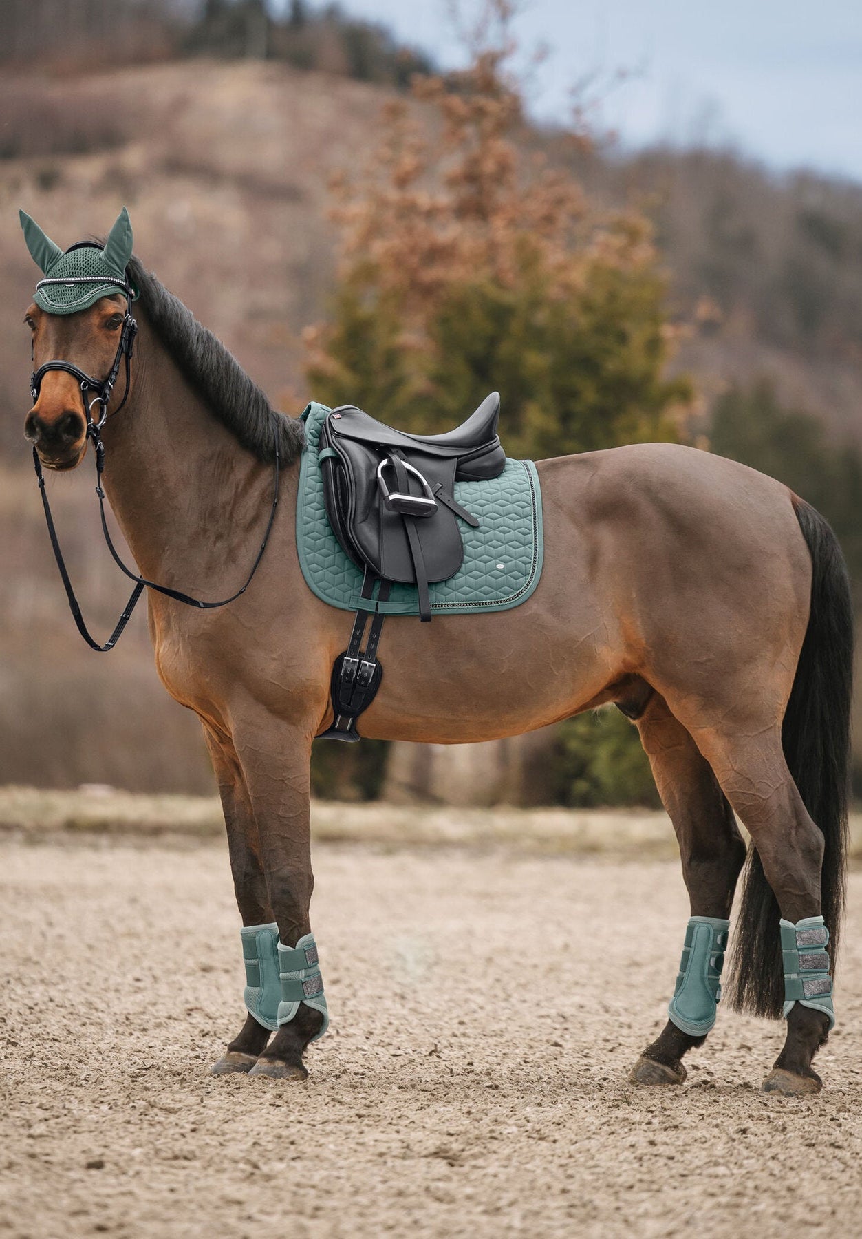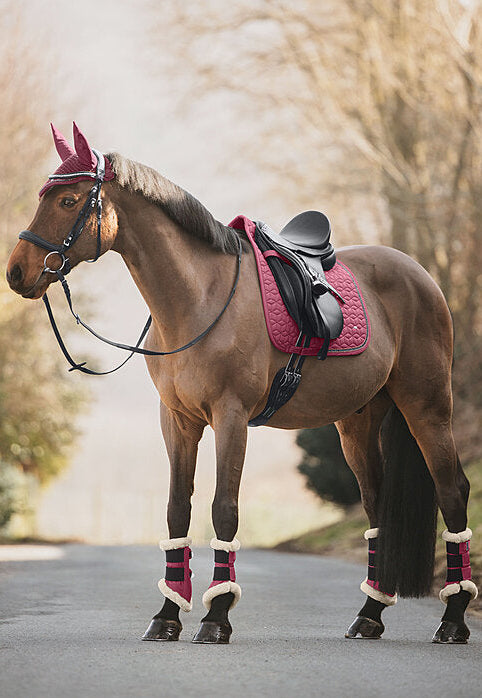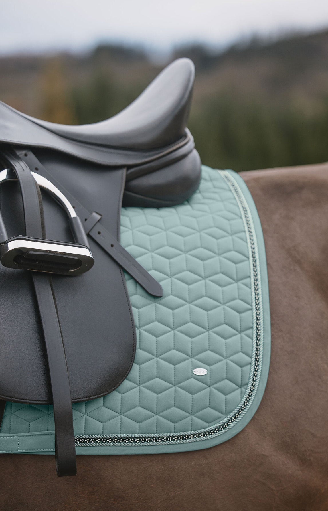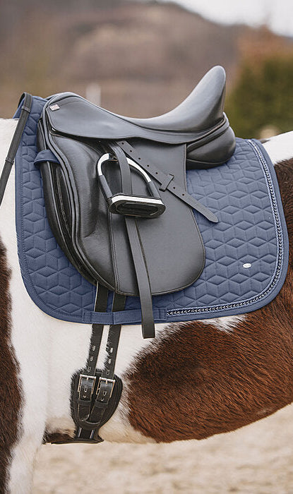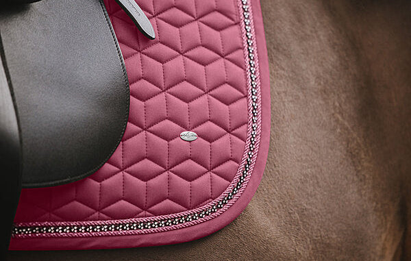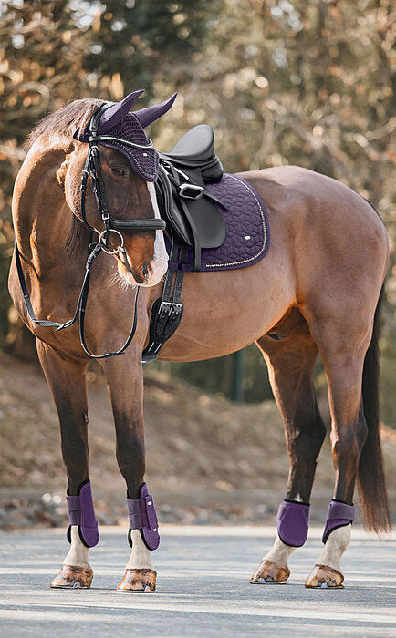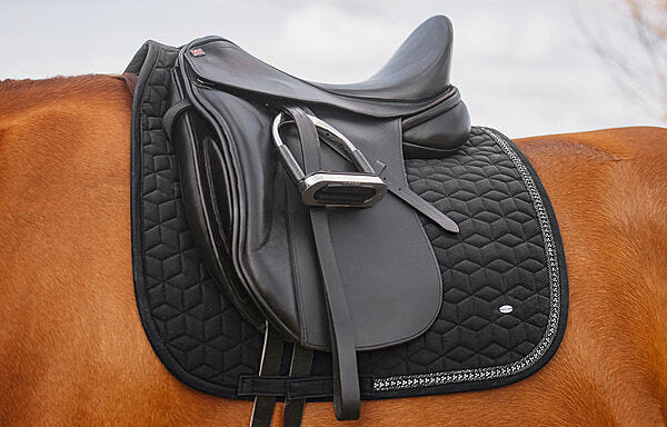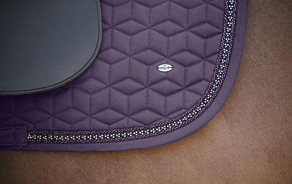 Sudadero brillante adornado con pequeños brillantes y doble cordón decorativo reluciente. Presillas para la silla y la cincha con prácticos cierres de velcro. Parte inferior de malla transpirable que absorbe la humedad. 100% poliéster.
