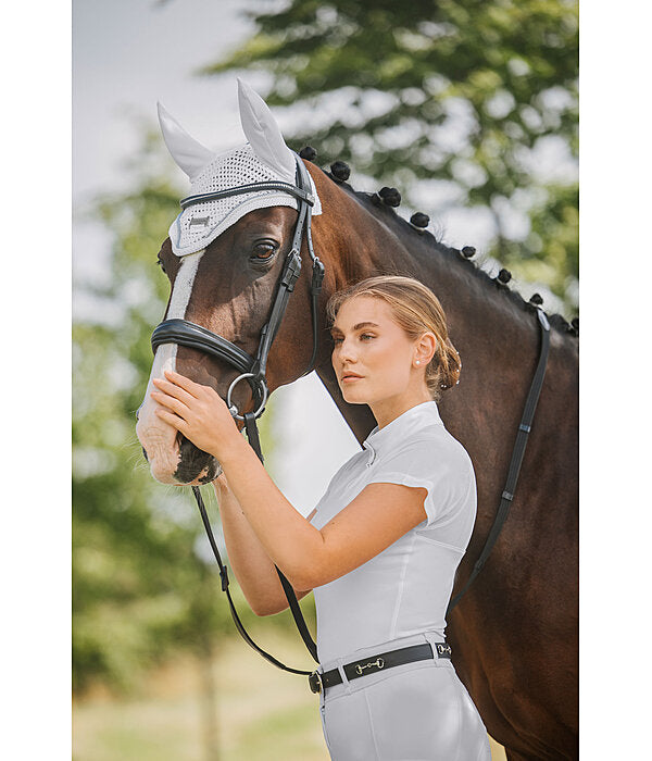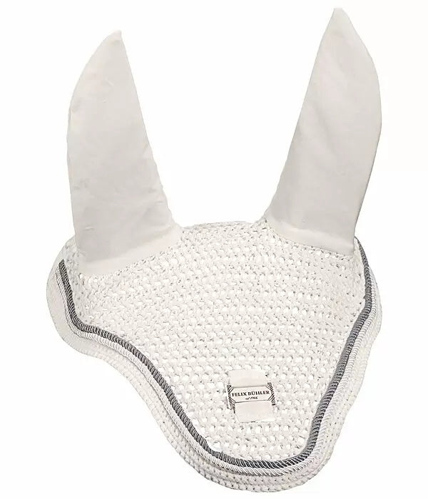 Orejeras antimoscas de ganchillo grueso con doble cordón decorativo brillante y una pequeña placa metálica. Orejeras elásticas para una comodidad óptima y cierres de velcro para una sujeción segura a la brida. Gorro: 100 % poliéster, orejeras: 88 % poliéster, 12 % elastano.