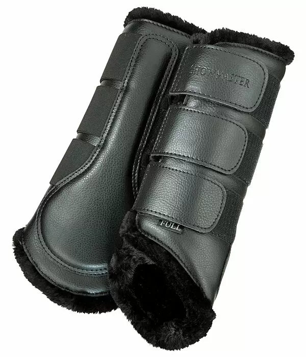 Protectores de doma clásica confeccionados en piel sintética resistente, con forro polar suave y acogedor. Incorporan correas elásticas de velcro para un ajuste perfecto y seguro. Se venden por pares.
