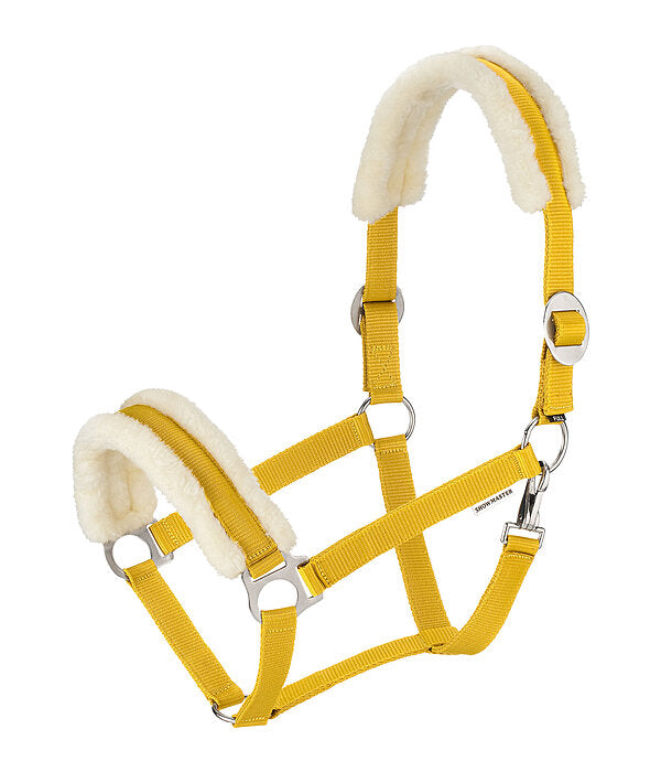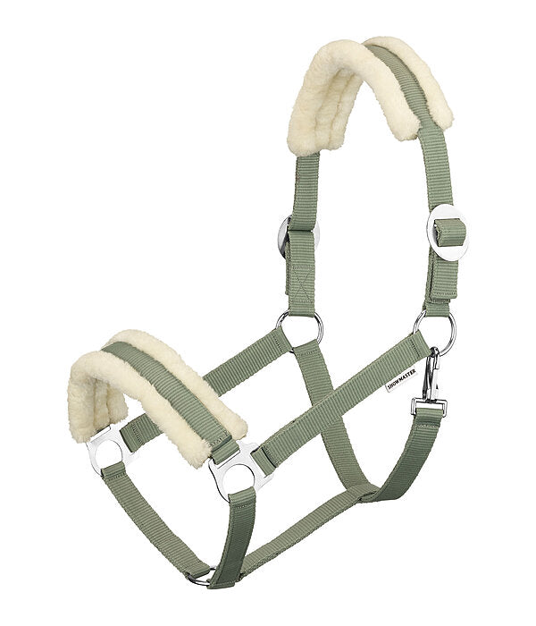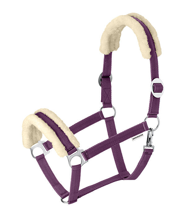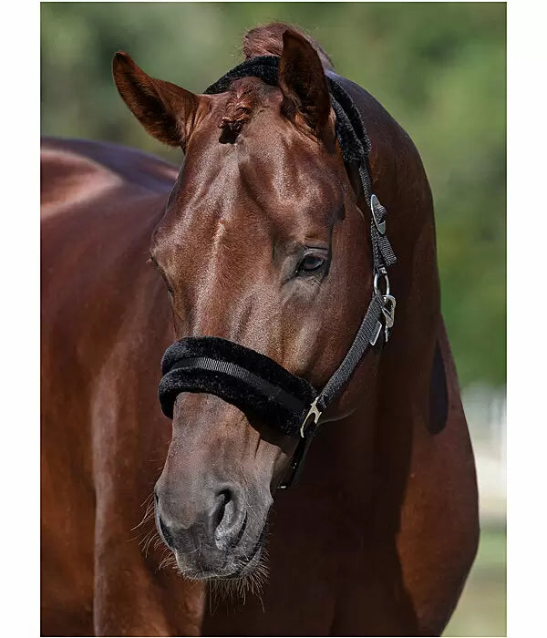 Cabezada suave con borreguito para proteger contra las rozaduras. Tamaño ajustable en ambos lados. Herrajes de color plata. Cabestro 100% polipropileno, felpa 100% poliéster.