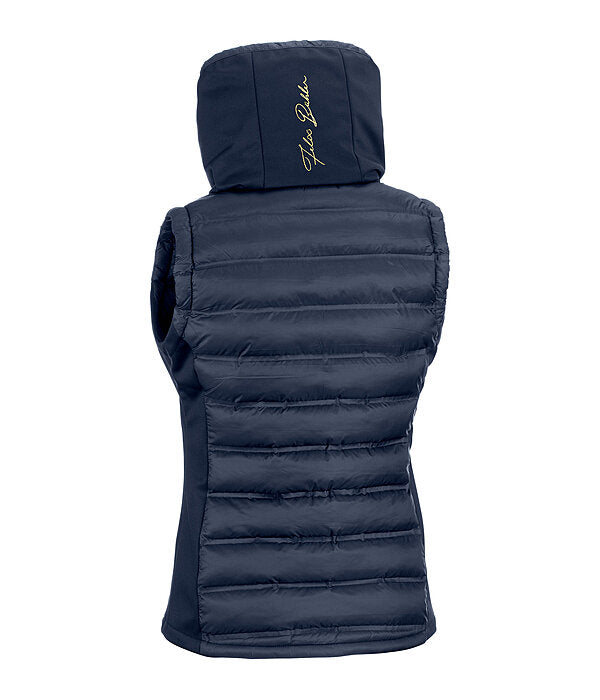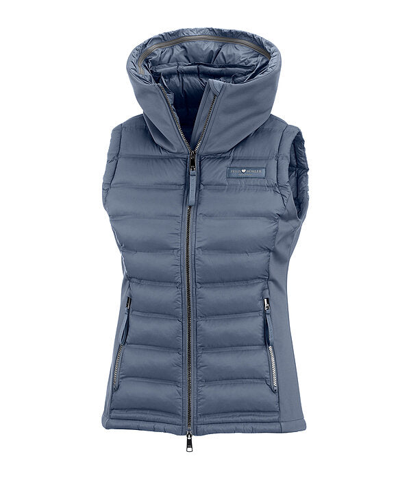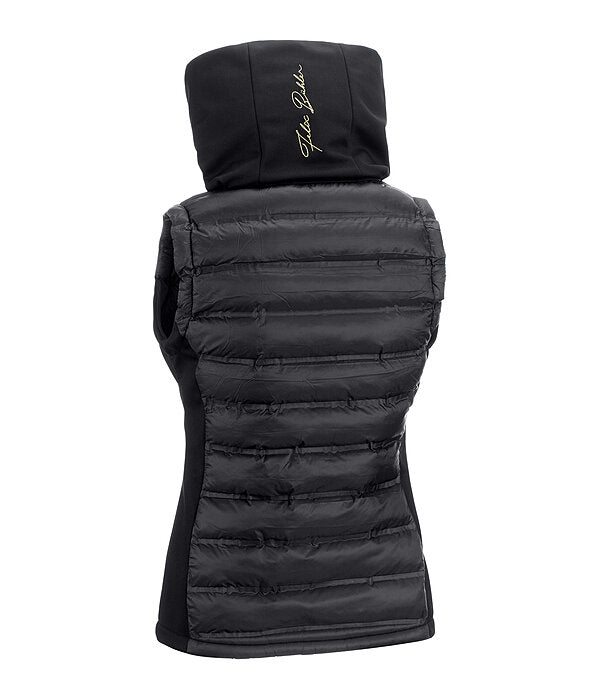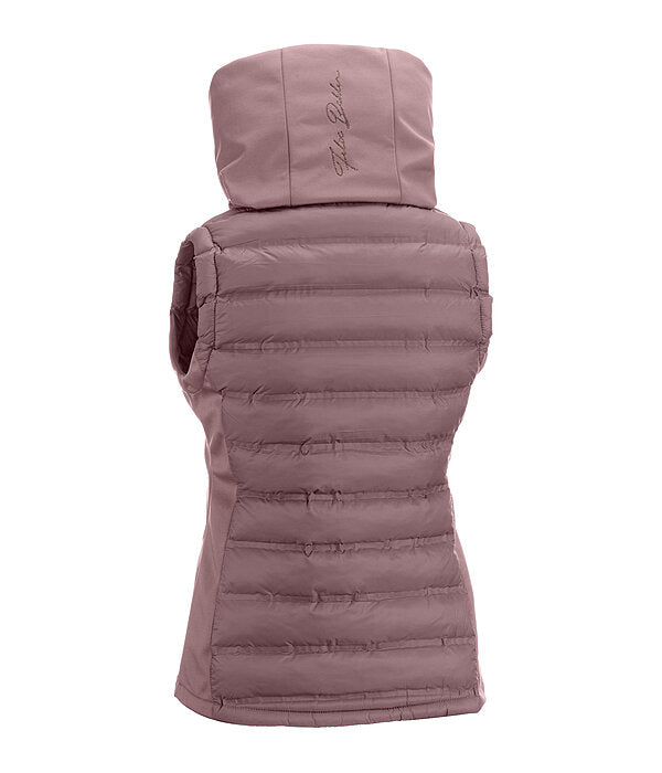 Un magnífico chaleco de equitación confeccionado en softshell elástico y nailon con un relleno extrasuave tipo plumón en la parte delantera y trasera. Resistente al viento. Cuello doble y capucha acolchada